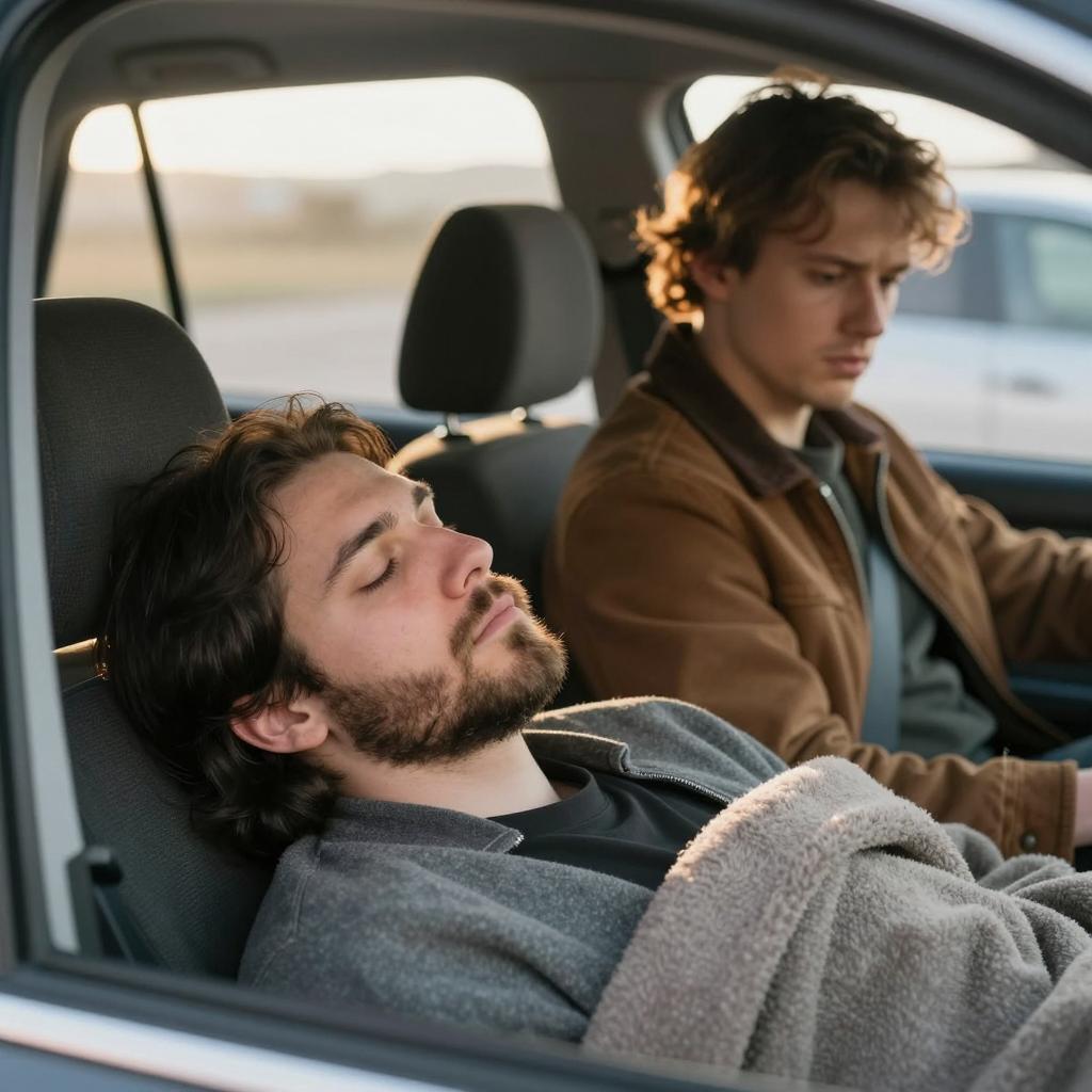 Photograph of four people inside a car during a road trip. The driver, a man with dark hair wearing a maroon polo shirt, grips the steering wheel with a white tissue in hand. A blonde woman in a light denim jacket sits in the front passenger seat with her eyes closed and mouth slightly open. In the back seat, a teenage boy with red curly hair wearing a blue shirt and beige jacket looks at the camera, while a girl with long brown hair sits next to him with her eyes closed. Beige and brown car interior with sunlight streaming through the windshield and a yellow boxed tissue on the dashboard.