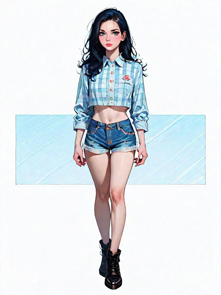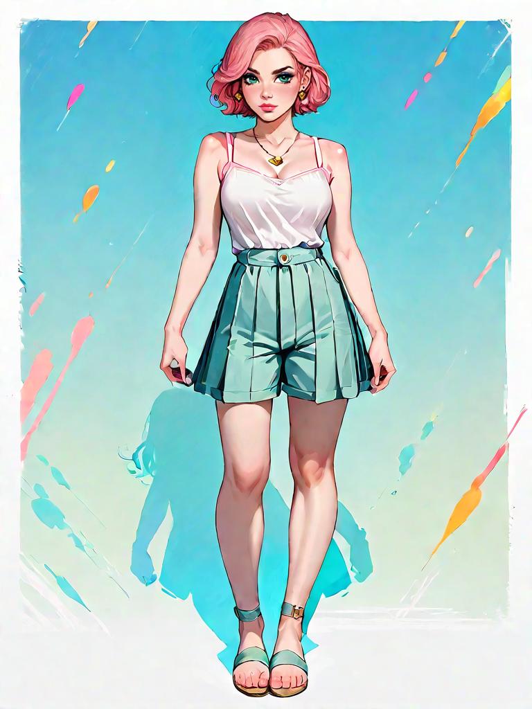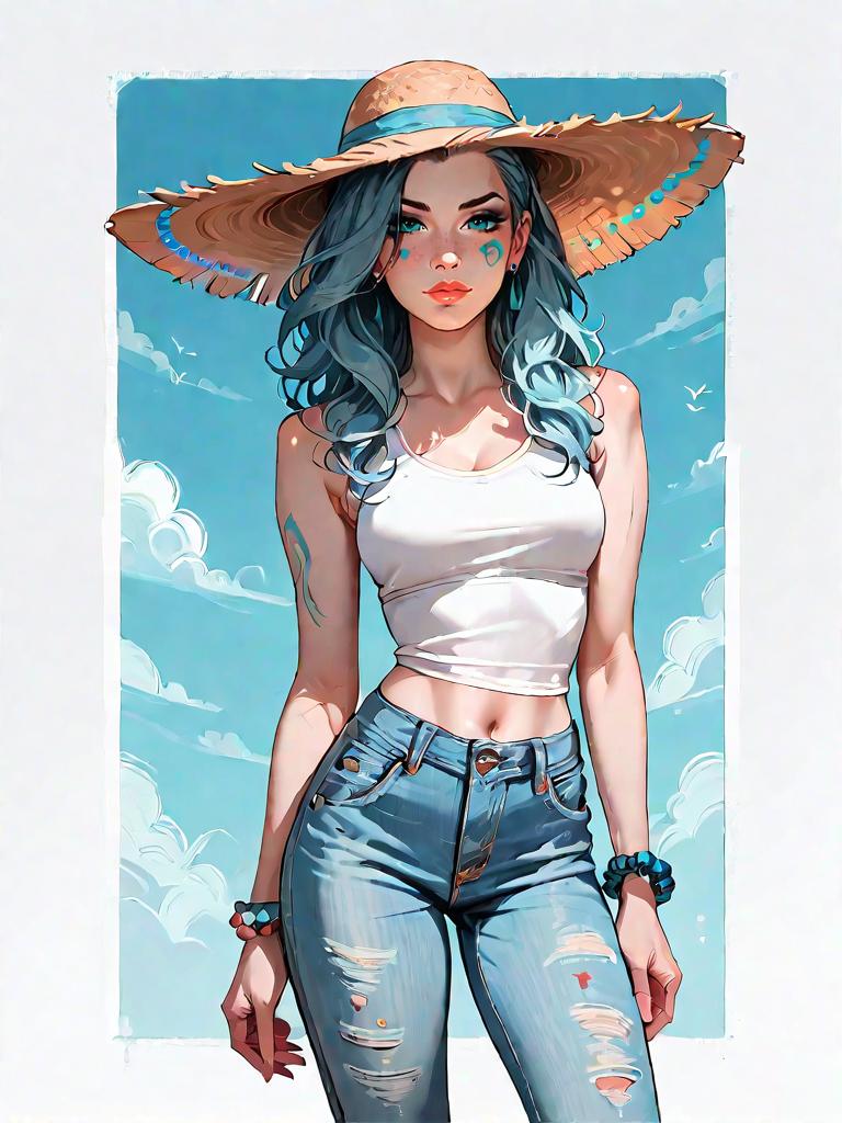 Digital artwork of a young woman with medium-length blue hair wearing a red sleeveless crop top featuring an elephant print, paired with blue skinny jeans decorated with colorful patches. She accessorizes with layered bracelets and a pendant necklace, standing confidently against a soft, pastel sky background.