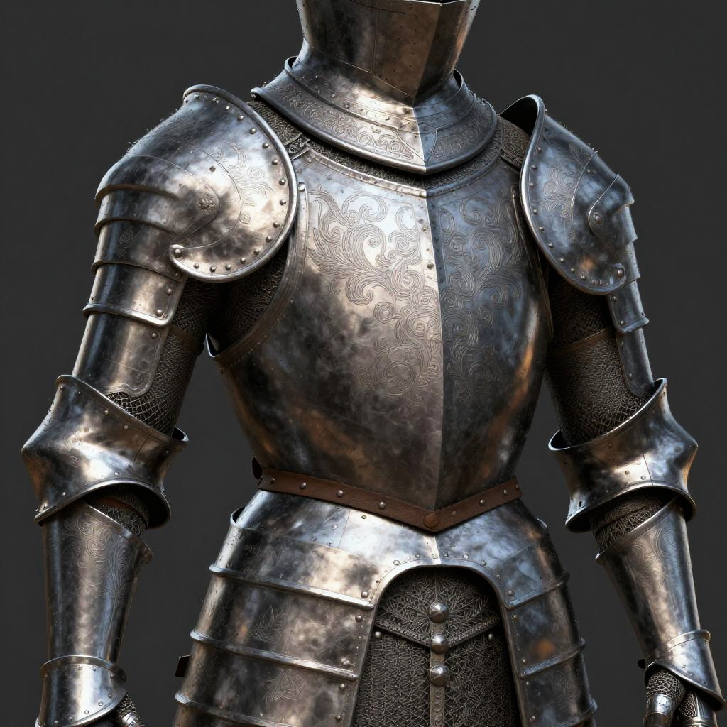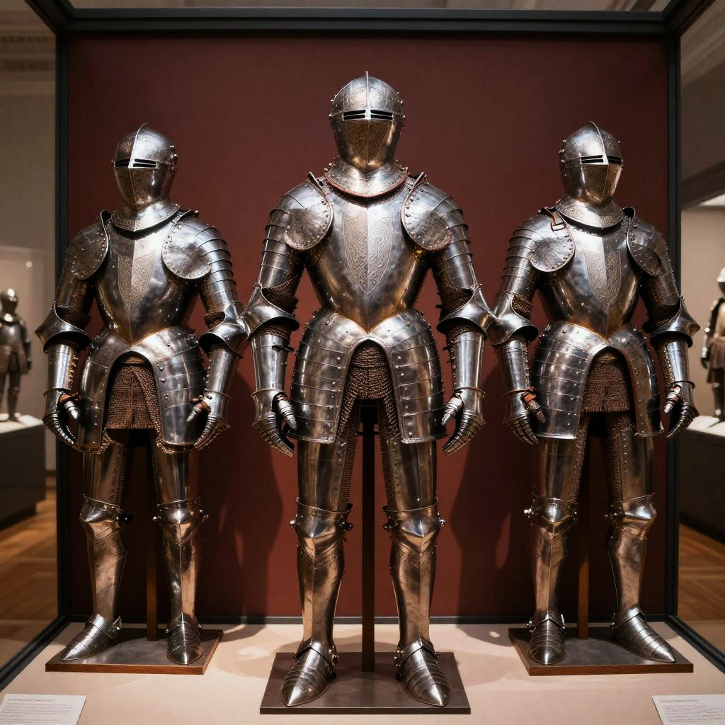 Welsh armor display in museum, authentic medieval armor set with engraved knotwork designs, polished steel gleaming under spotlight, wooden stands, rich historical atmosphere