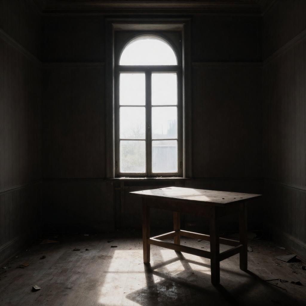 Photograph of a dark, abandoned room with a large, bright window allowing light to stream in. The room has wooden walls, a broken wooden table, and scattered debris on the floor. Exposed beams and a high, arched window add to the dilapidated atmosphere.