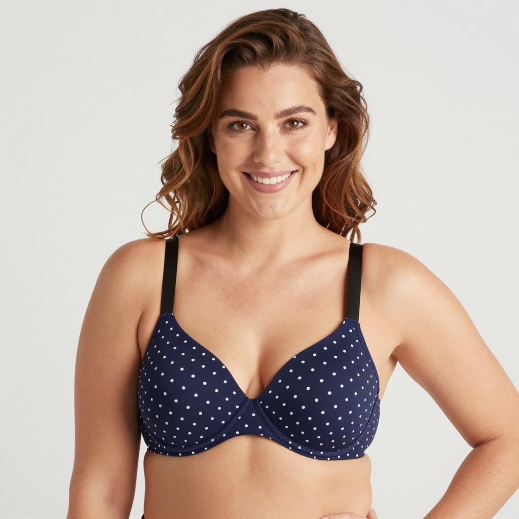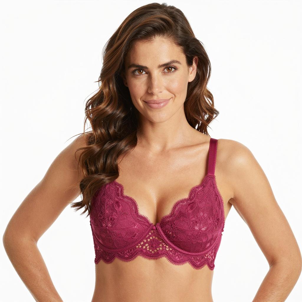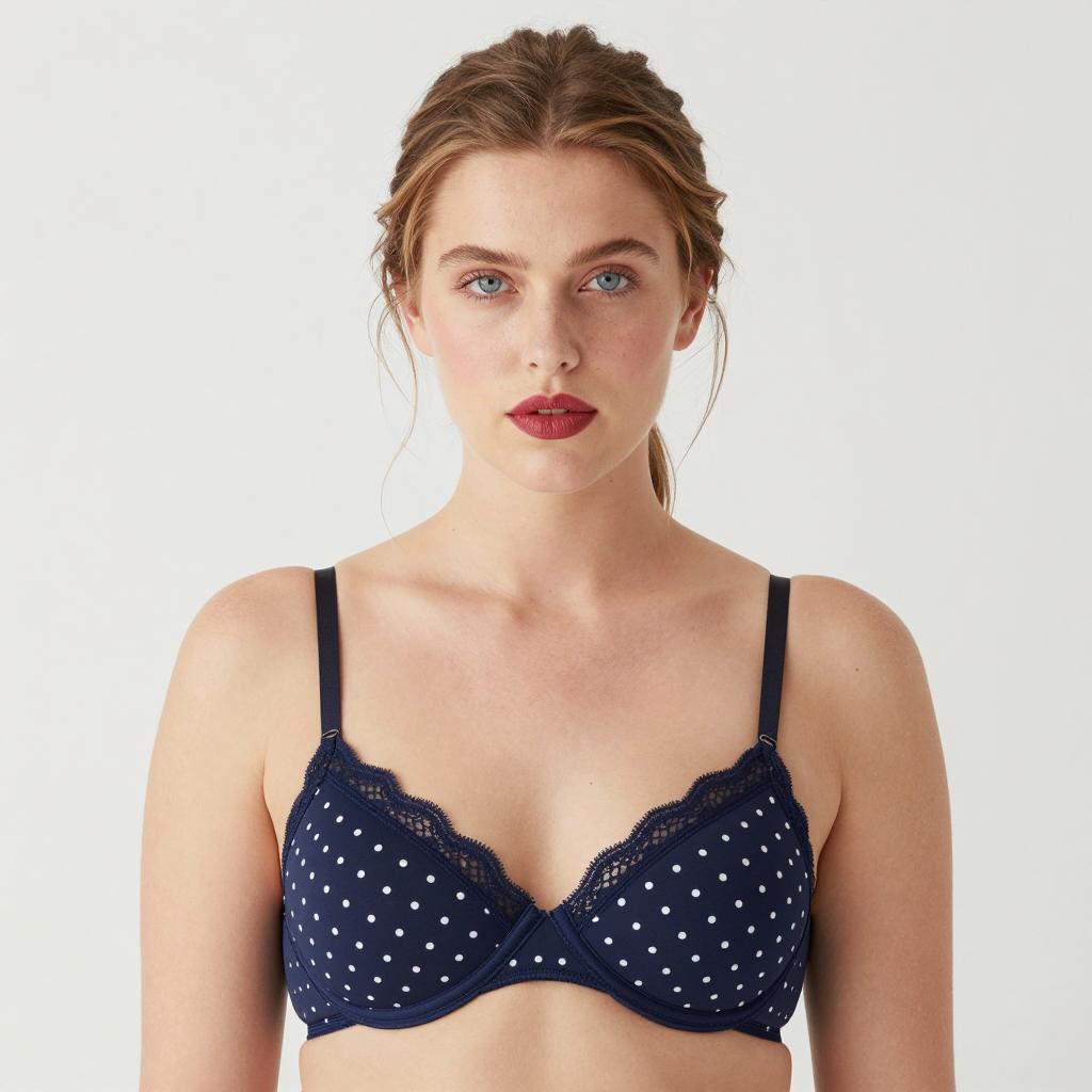 Photograph of a white woman with wavy brown hair, blue eyes, and a smile. She wears a blue and white gingham check bra with white lace trim. She has light skin, a medium build, and is holding her hair with her right hand. The background is plain white.