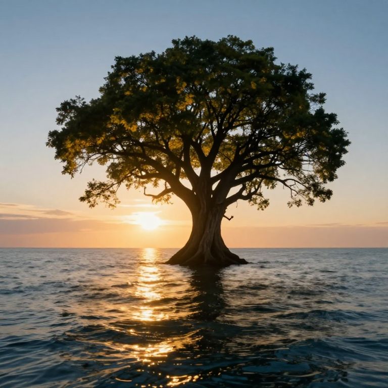 Imagine a surreal seascape at dawn, where the sky transitions from deep indigo to vibrant hues of pink and gold as the sun begins its ascent. This scene captures both the tranquil beauty and ethereal mystique of nature, reminiscent of surrealist landscapes with melting timepieces and floating objects defying gravity. From an aerial perspective, this panoramic image showcases a colossal, gnarled tree reaching out over the serene waters, its twisted roots submerged beneath the surface, creating a mesmerizing interplay between land and sea. The emotional gradient shifts from serene tranquility to enchanting mystery as gentle ripples reflect the celestial hues of the sky, evoking a sense of wonder and introspection within the beholder.