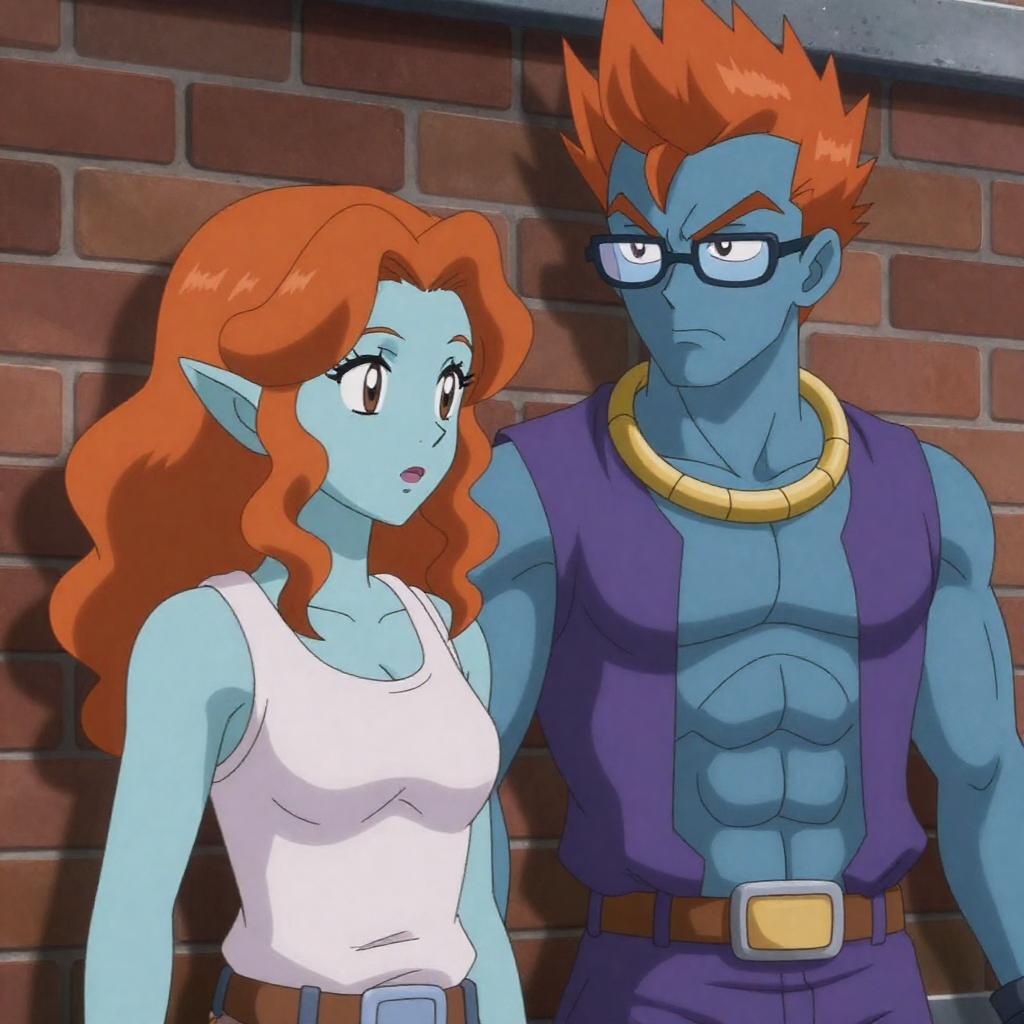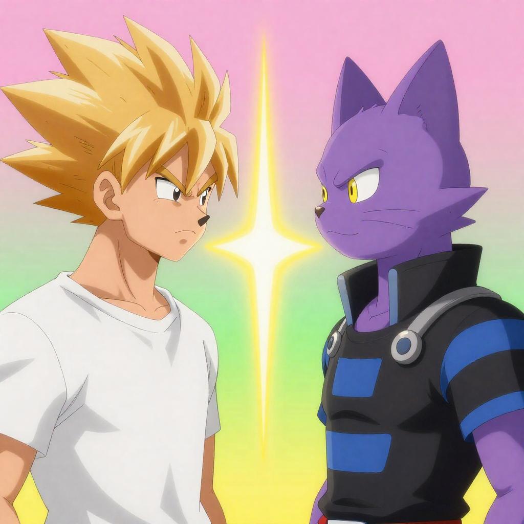 Digital illustration of two anime characters facing each other. Left: spiky blond-haired male with intense expression, white shirt. Right: purple-furred anthropomorphic cat with yellow eyes, black and blue striped armor. Bright yellow energy flare between them. Background: vibrant pink, green, and yellow gradient.