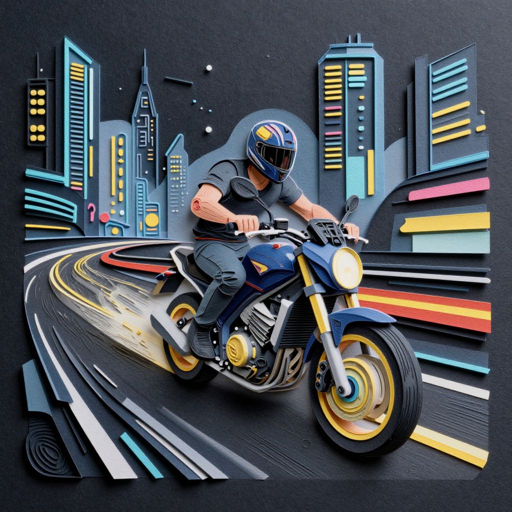 A paper quilling, layered paper depiction of a man riding a motorbike through a futuristic city, with neon lights illuminating the speed trails and glowing streets as he races through the urban night scene, arcanefgtnr stylish dark illustration