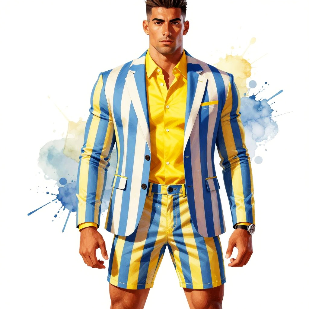 A digitally illustrated muscular man stands confidently wearing a striking blue, yellow, and white vertically striped suit jacket and matching shorts paired with a bright yellow shirt. The artwork features sharp details and vibrant colors with watercolor splashes in the background, showcasing a modern fashion-forward style with a touch of artistic flair.