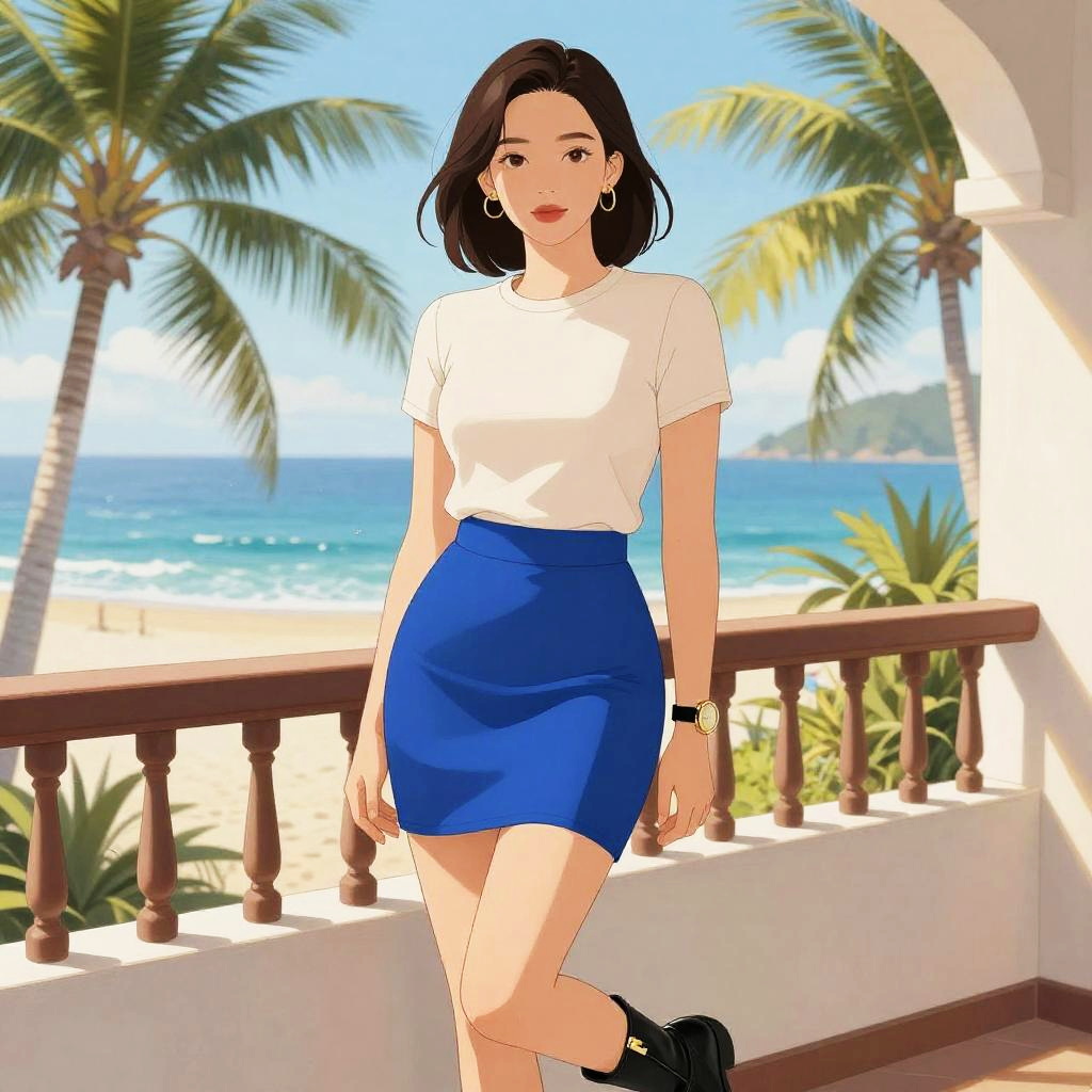 A Plus-size woman in a casual chic outfit featuring a knotted light blue denim shirt and a fitted grey mini skirt, accessorized with a black leather shoulder bag and strappy flat sandals, stands on a fishing pier with waves crashing nearby, illustrated in the style of NBM graphic novels. Sexy. Pretty face and beutiful eyes