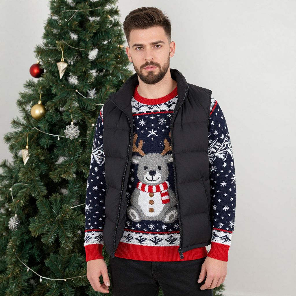 "scarface christmas sweater, 1boy, male focus, solo, facial hair, beard, christmas, brown hair, looking at viewer, christmas tree, realistic, pants, vest Realistic photo of casual sexy person with pretty face"