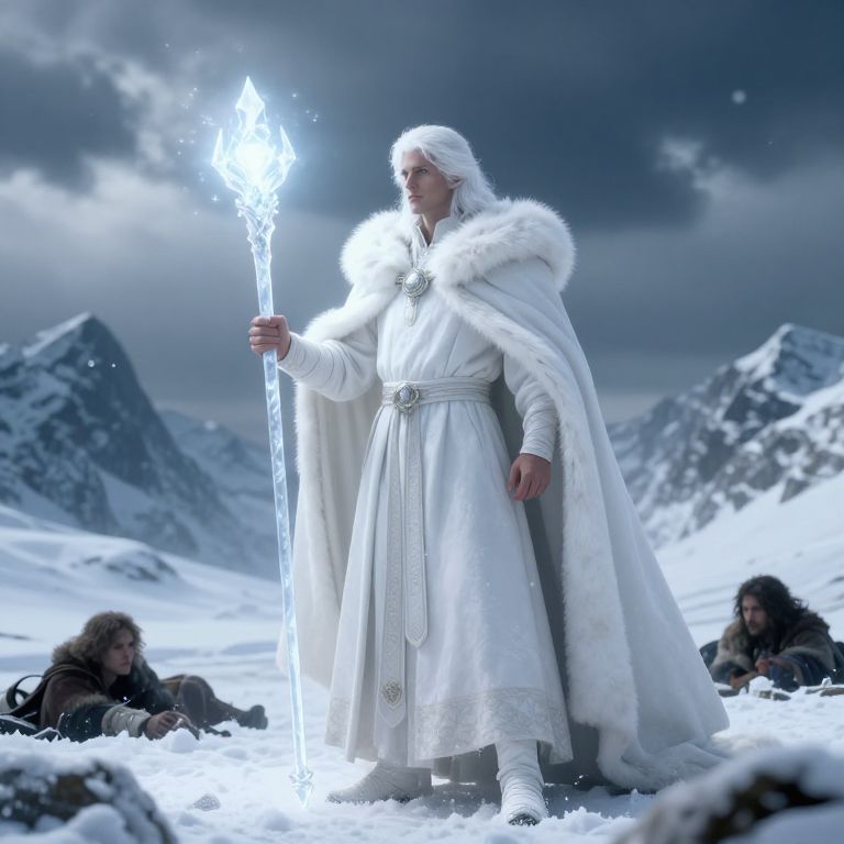 Digital artwork depicting a tall, white-haired man standing in a snowy mountain landscape. He wears a long, white fur-trimmed robe with a belt and white boots. His right hand holds a glowing, crystalline staff emitting bright white light. Two hunched, fur-clad figures lie in the snow at his feet, partially obscured. The sky is dark and cloudy, with snow-covered peaks in the background. The man's stern expression and commanding presence contrast with the cold, serene landscape. The overall color palette is dominated by whites, blues, and grays, enhancing the icy, mystical atmosphere.