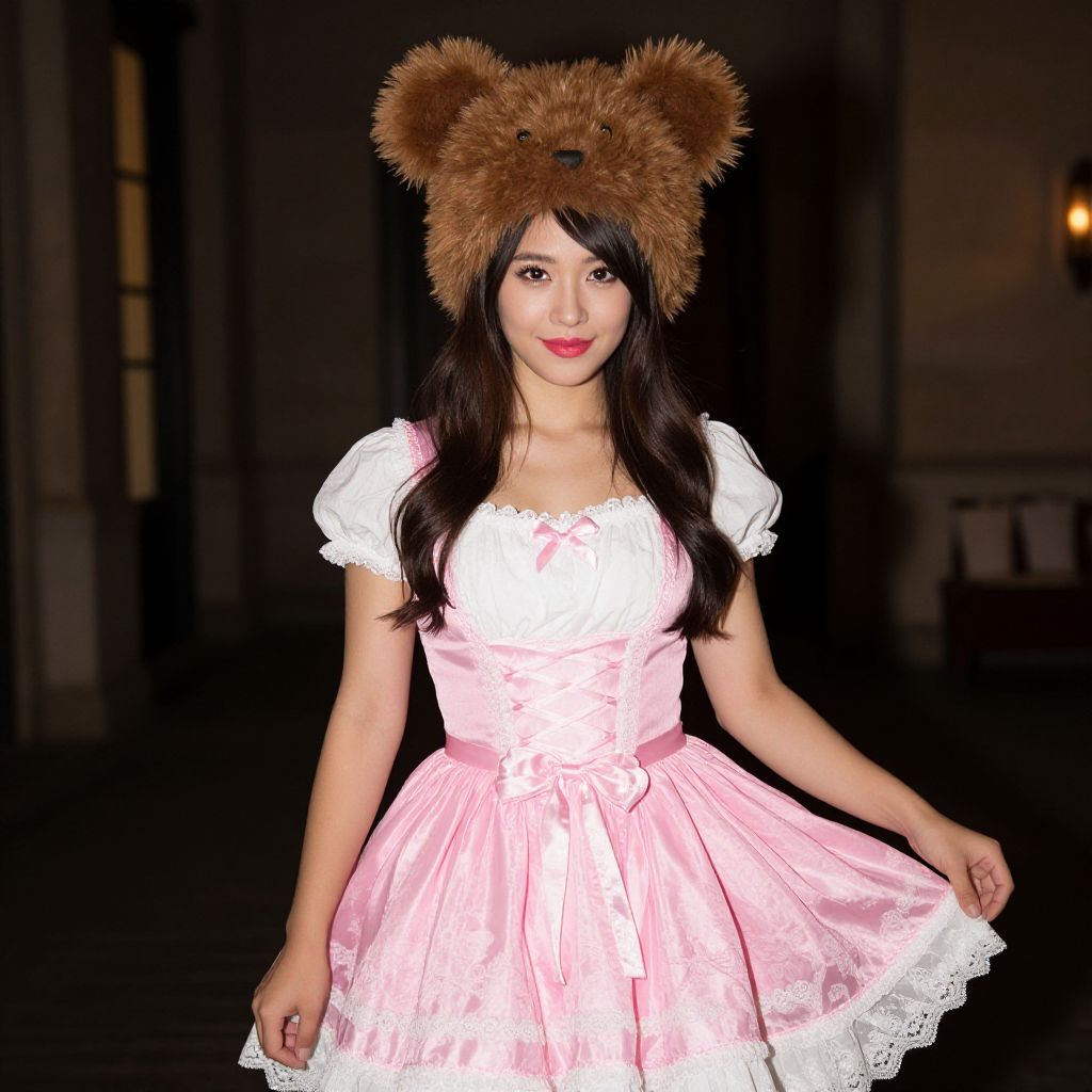 Photograph of an Asian woman with long, dark hair and fair skin, wearing a pink, short-sleeved, lace-trimmed dress with a full skirt. She has on a brown, furry bear-eared hat. She is smiling with bright red lipstick. The background is dark, making her and her outfit stand out. The dress has a fitted bodice with a subtle, decorative bow at the center. She holds the skirt slightly outwards with both hands. The lighting highlights her face and outfit, casting shadows in the background. The overall style is whimsical and playful.