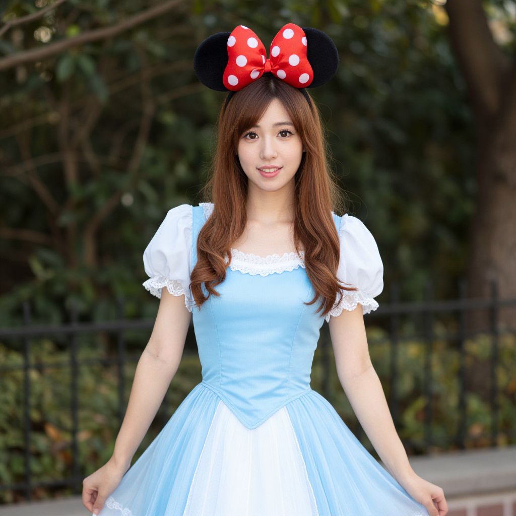 Photograph of an Asian woman with long black hair, wearing a pink lace dress, white puffed sleeves, and a brown bear hat, smiling against