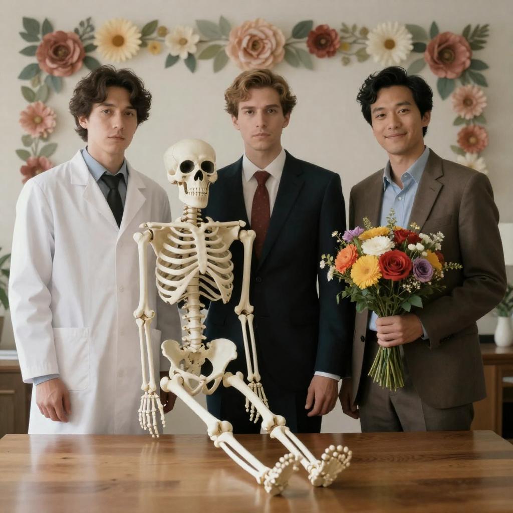 Photograph of three men in a room with a floral backdrop. Center man in dark suit, white shirt, red tie, holding a skeleton. Left man in white lab coat, dark hair, serious expression. Right man in brown suit, blue shirt, holding colorful flowers, smiling. Wooden table in foreground. Skeleton between left and center men. Flowers cover background wall.