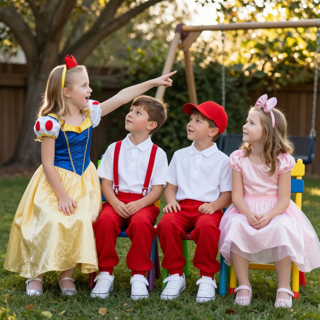 Photograph of four children in a grassy backyard. A blonde girl in a yellow Cinderella dress with puffed sleeves and red bow points upward. Three boys, wearing white shirts with red suspenders and red pants, sit on colorful chairs. One boy also wears a red cap. A blonde girl in a pink dress with a pink bow sits to the right. Trees and a wooden fence are in the background, with sunlight filtering through leaves. The children look up at the girl in the Cinderella dress.