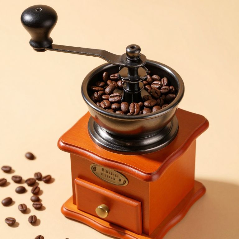 Roasted coffee beans rest inside a sleek manual coffee grinder, its black handle positioned above a vibrant orange base, surrounded by scattered grains on a warm-toned surface.