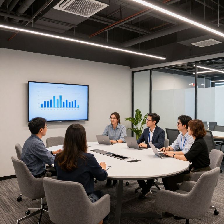 Corporate office room designed for teamwork, round meeting table, wall-mounted screens, comfortable seating, modern industrial decor, exposed ceilings, energetic and productive atmosphere