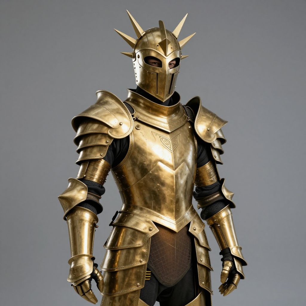 Solaris Knight Costume, man in armor with spiked headpiece and gold armor