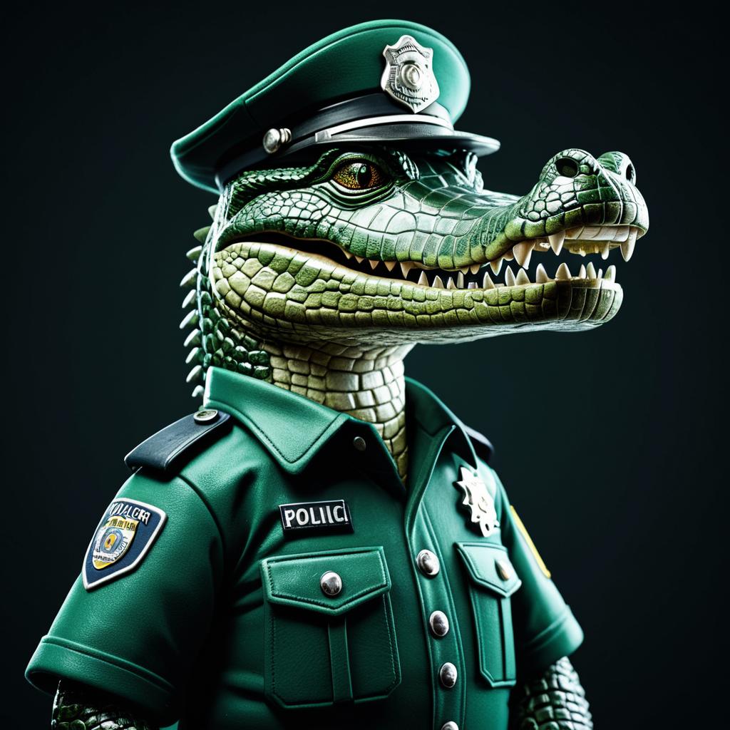 Highly detailed cartoon-style illustration of a crocodile dressed as a police officer. The crocodile wears a dark green police uniform with silver accents, including a hat, badges, and patches. The image uses accent lighting to emphasize textures and features, combining a playful yet authoritative character design in NFT style.