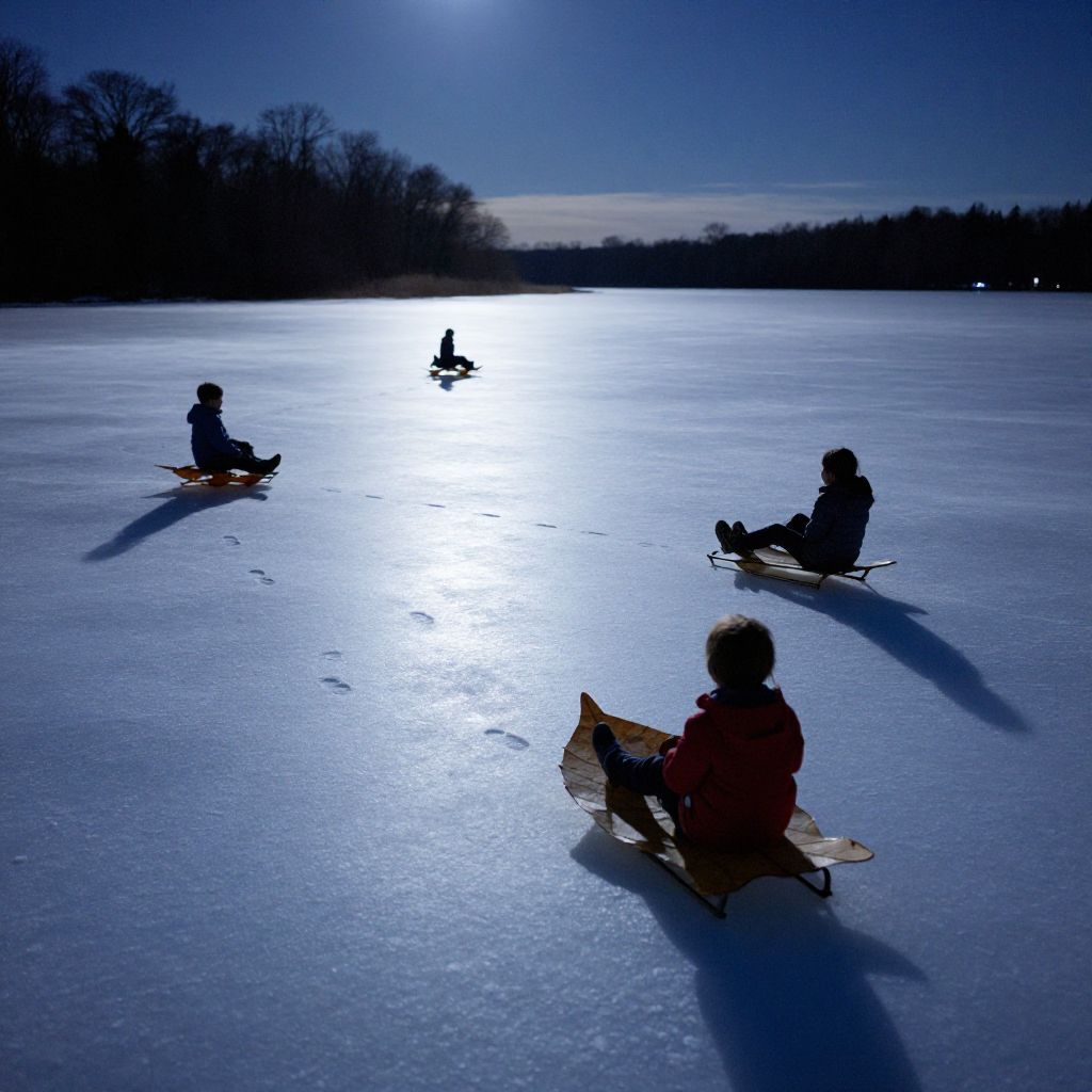 Photograph of four children ice skating on a frozen lake at night. The bright full moon reflects off the icy surface, creating a glowing path. Silhouetted against the blue sky, the children wear winter clothing and sit on small sleds, holding onto the edges. Their shadows stretch behind them on the ice. Bare trees line the distant horizon, and faint lights from a distant building are visible. The overall scene is serene and cold, with the moonlight casting a crisp, blue hue over the landscape.