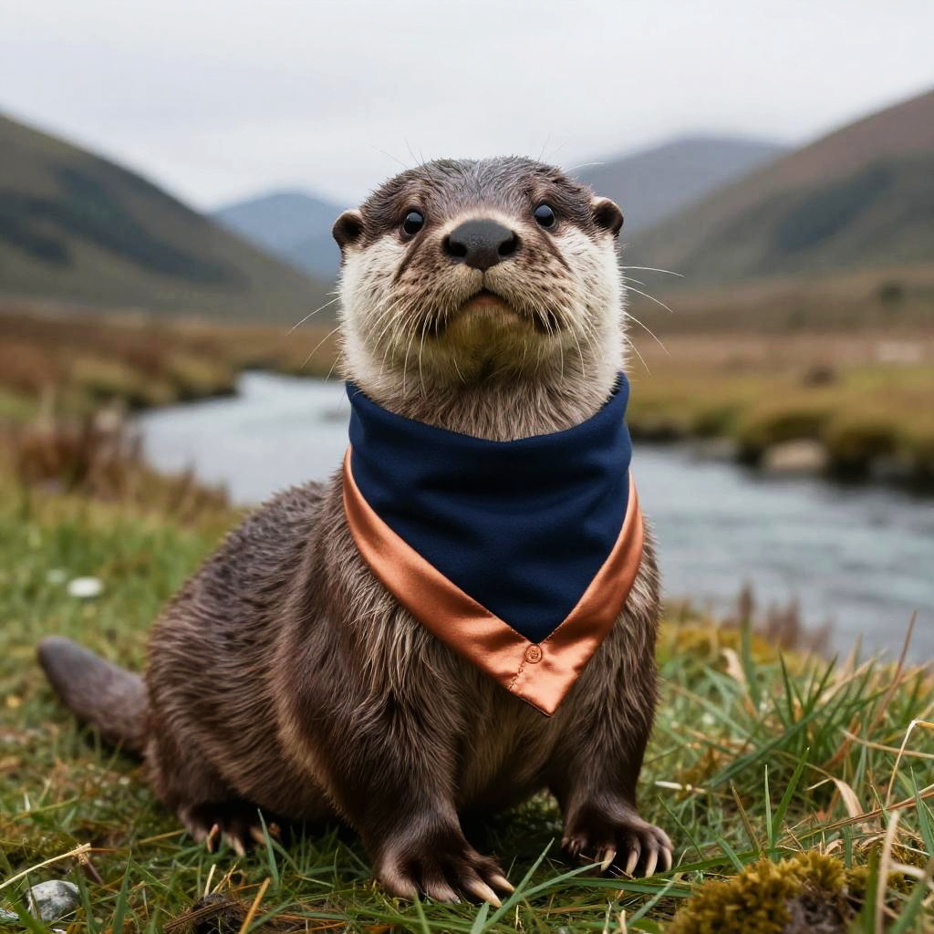 Elegant portrait of an otter in a dapper scarf with colors navy and copper against a grassy river valley background, showcasing its regal presence.