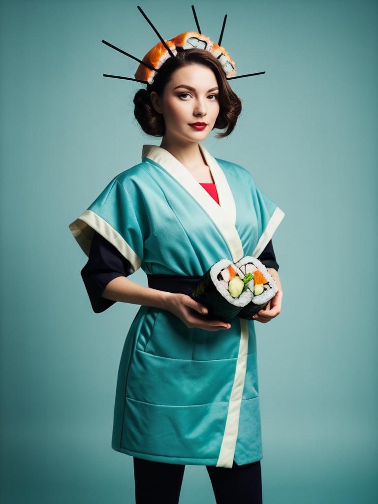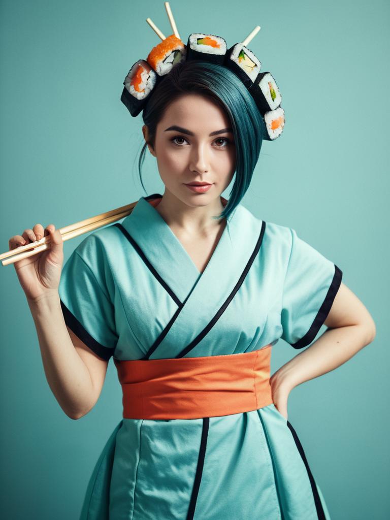 Person in Sushi Roll Costume, cosplay festival portrait, photorealistic realism --sref 1387