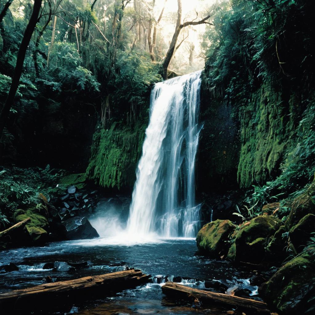 A captivating image of a tall, enchanting waterfall cascading into a serene pool surrounded by dense green foliage and moss-covered rocks. The forest setting is tranquil with softened light filtering through the canopy, highlighting the vivid greenery and the gentle mist rising from the waterfall's base. The clear flowing stream continues over smaller rocks in the foreground, enhancing the peaceful natural scene.