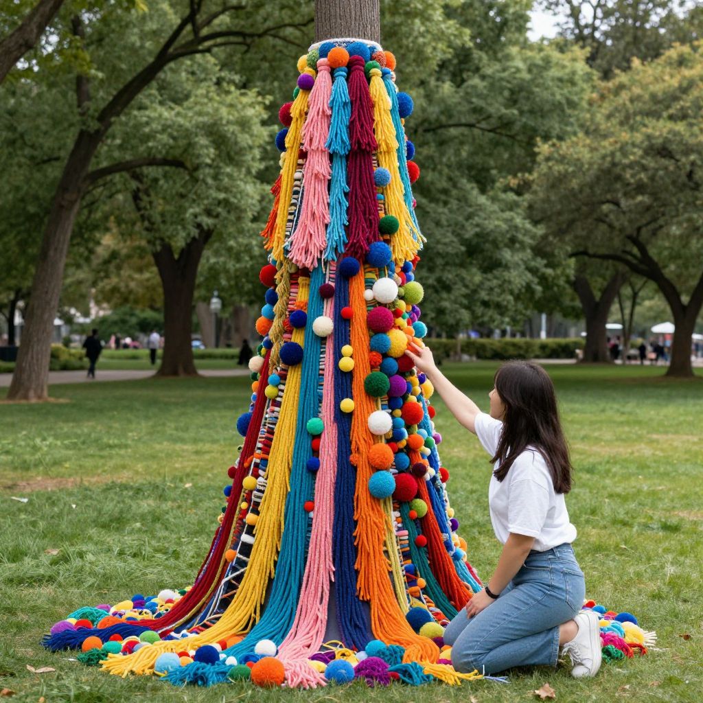 Vibrant yarn bombing installation stands tall in a park, adorned with colorful tassels and pom-poms, as a woman kneels beside it, showcasing its intricate details against a backdrop of green grass and trees.