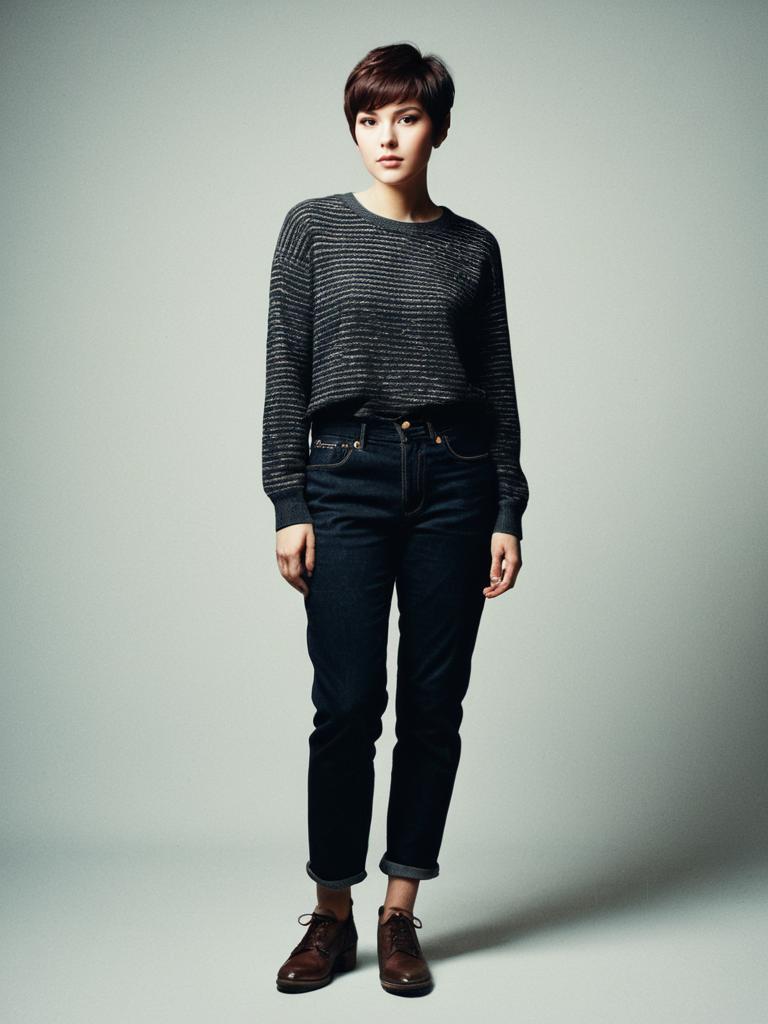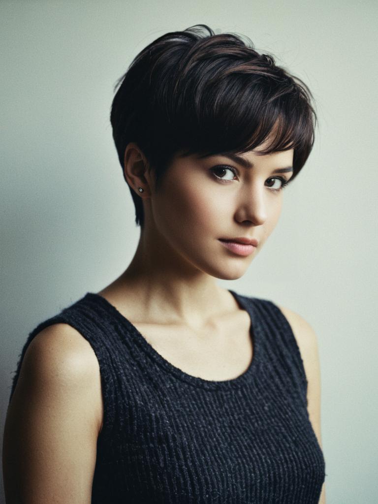 Woman with Dark Brown Pixie Cut, full-body editorial portrait, photorealistic realism