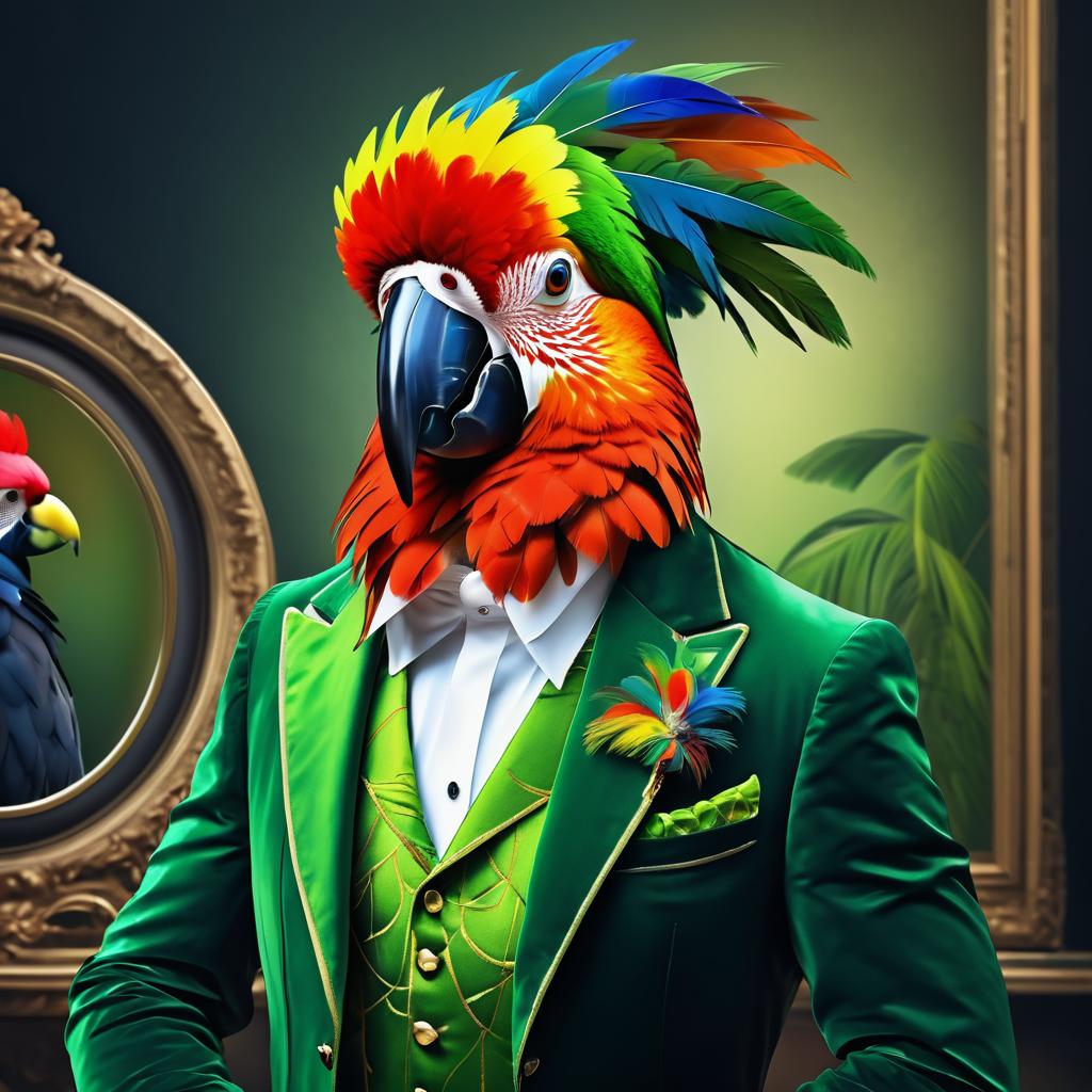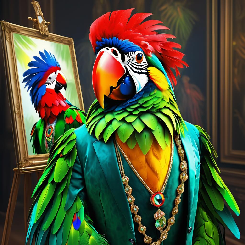 A stern-looking parrot dressed as an artist. Styled as a magnificent digital painting with high detail, capturing an elegant atmosphere.