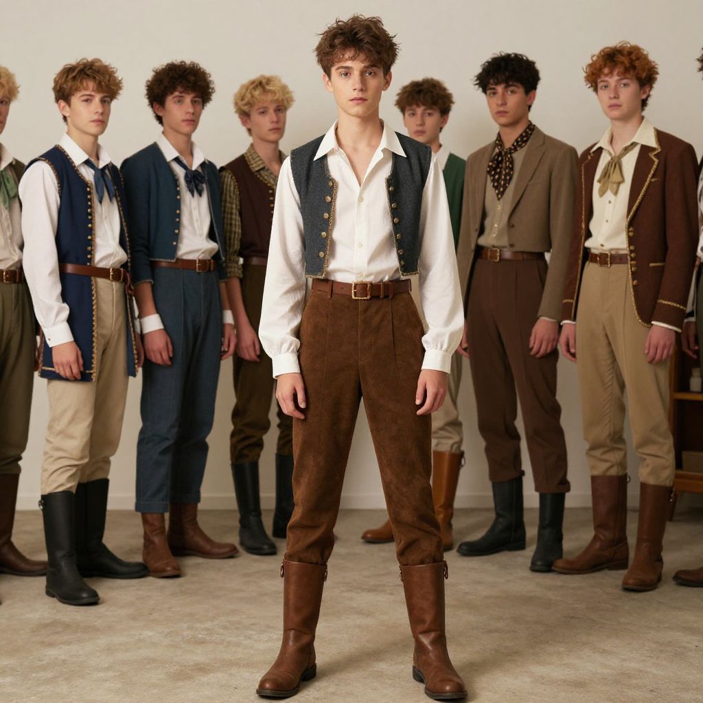 Photograph of seven young men standing in a line against a plain white background. They all have curly hair and are dressed in historical-style clothing, featuring white shirts, vests, and brown or blue trousers. The central figure, with brown curls and a focused expression, wears a white shirt with a brown vest and brown trousers. The others wear similar attire, with variations in vest and trousers colors. They are all standing with their hands by their sides, wearing black or brown boots. The image has a vintage, formal fashion show feel.