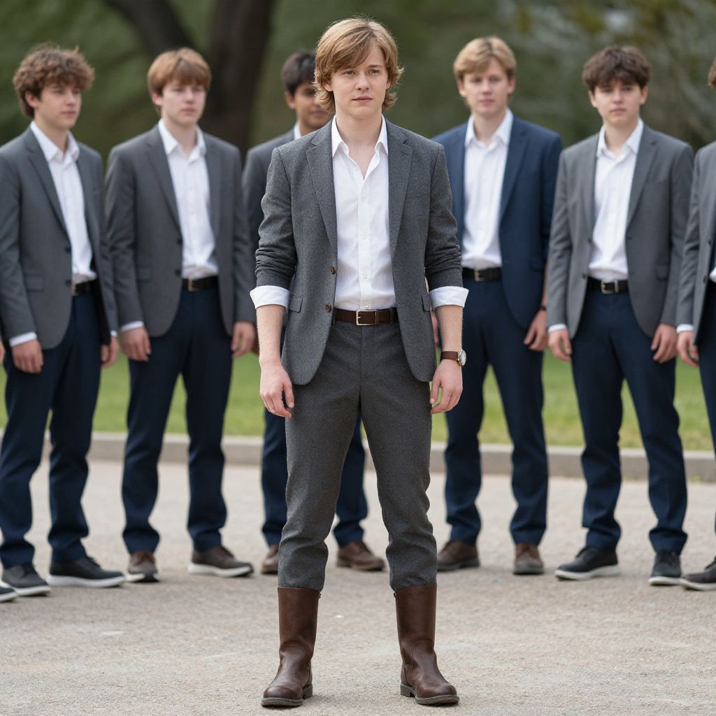 "fairy tale costume, male focus, boots, 1boy, solo focus, indoors, standing, brown hair, multiple boys Realistic photo of casual sexy person with pretty face"