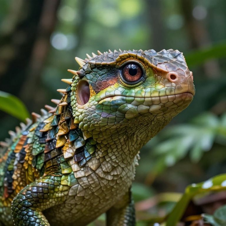 Close-up portrait of Hebis showing its textured, colorful scales and expressive eyes, with lush jungle foliage blurred in the background, capturing the essence of a mythical forest guardian in realistic yet fantastical style.