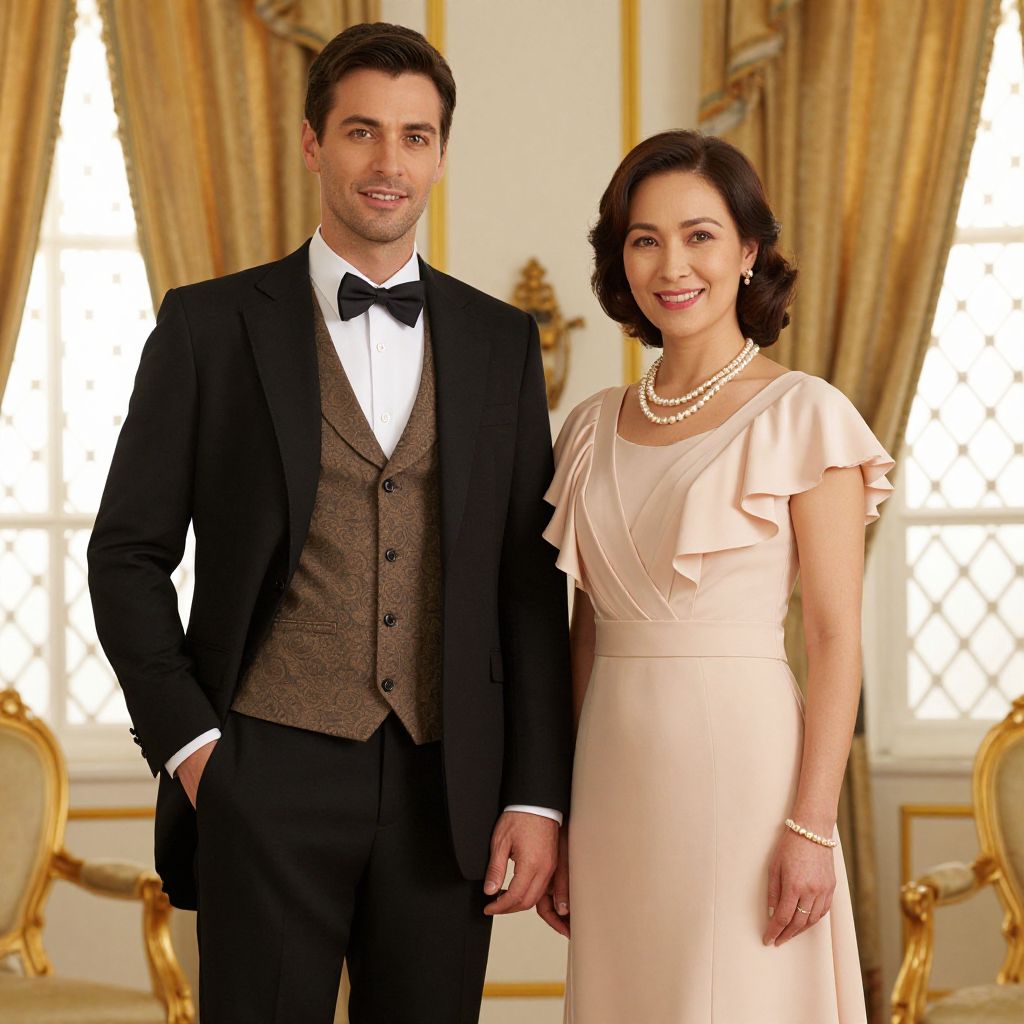 Elegantly dressed couple stands side by side in a grand room, the man in a formal black suit with a brown vest and bow tie, and the woman in a blush pink dress with ruffled sleeves and a pearl necklace, both smiling warmly against a backdrop of golden curtains and lattice-patterned windows.