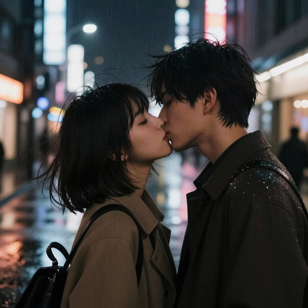 Anime boy and girl kissing in a rainy city street, neon lights reflecting on wet pavement, dramatic lighting, high contrast colors, emotional close-up, detailed hair and clothing with wind effects, bustling urban night scene