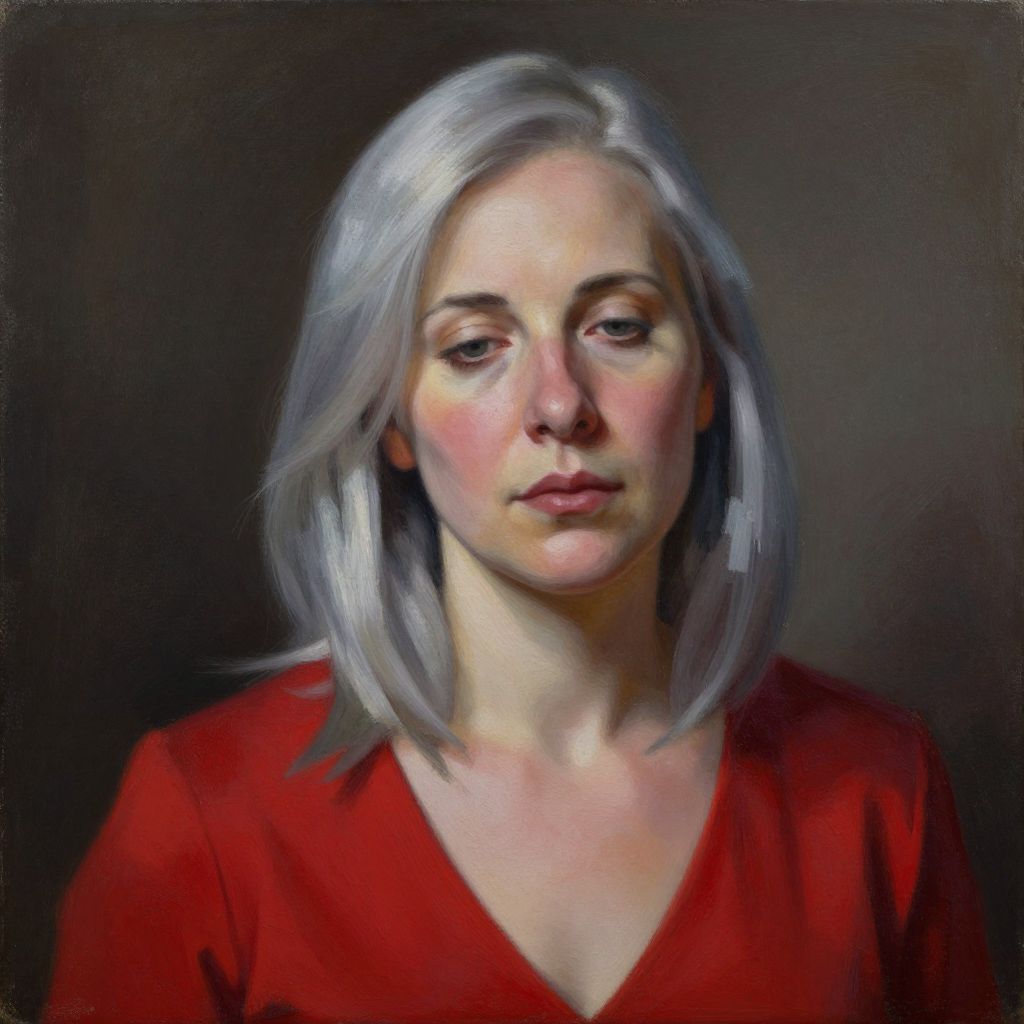 Digital painting of a fair-skinned woman with silver hair, wearing a red V-neck shirt, gazing downwards with a serene expression.