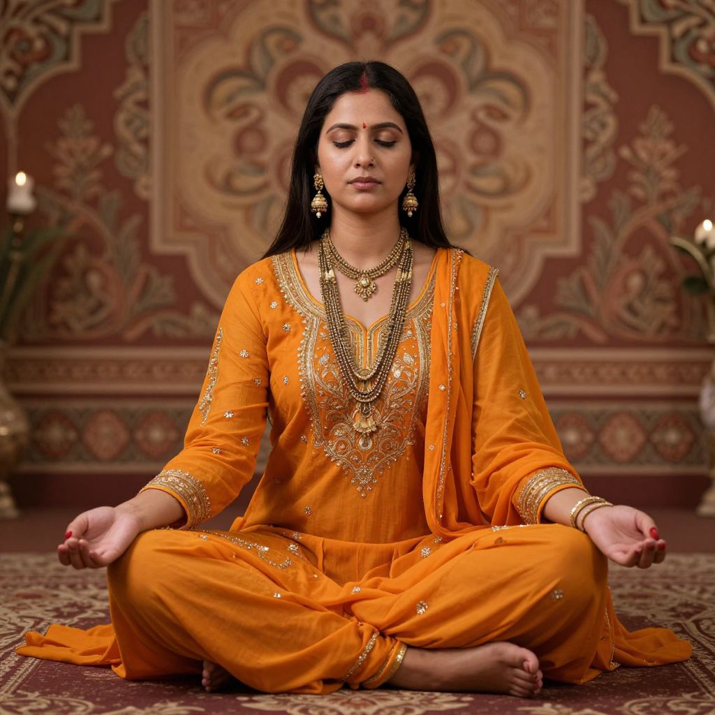 Meditating Indian woman seated cross-legged in a serene pose, adorned in vibrant orange traditional attire with intricate gold embroidery, complemented by layered necklaces and dangling earrings, against a backdrop of ornate floral patterns and warm earthy tones.
