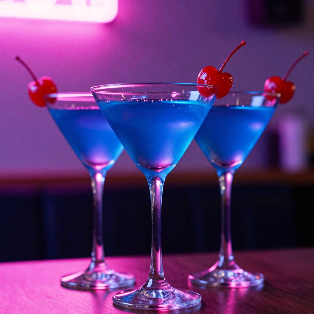 Photograph of two martini glasses with vibrant blue liquid, each adorned with a bright red cherry. The glasses are placed on a dark wooden surface, with a blurred background featuring pink and purple neon lights. The image has a sharp focus on the foreground glass, while the background glass is slightly out of focus. The overall vibe is colorful and lively.