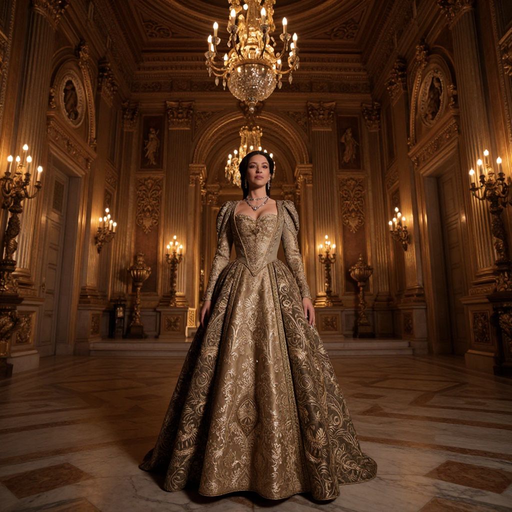 Photograph of a woman standing in an opulent, grand ballroom with ornate, baroque-style architecture. She wears an elaborate, golden, full-length gown with intricate embroidery, long sleeves, and a high, fitted waist. Her dark hair is styled in an elegant updo. The ballroom is illuminated by multiple chandeliers, casting a warm, golden glow. The walls feature detailed carvings, and the floor has a marble pattern. The woman's poised stance and the luxurious setting evoke a sense of regality and timeless elegance.