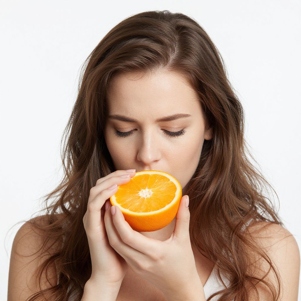 Woman trying to smell half an orange