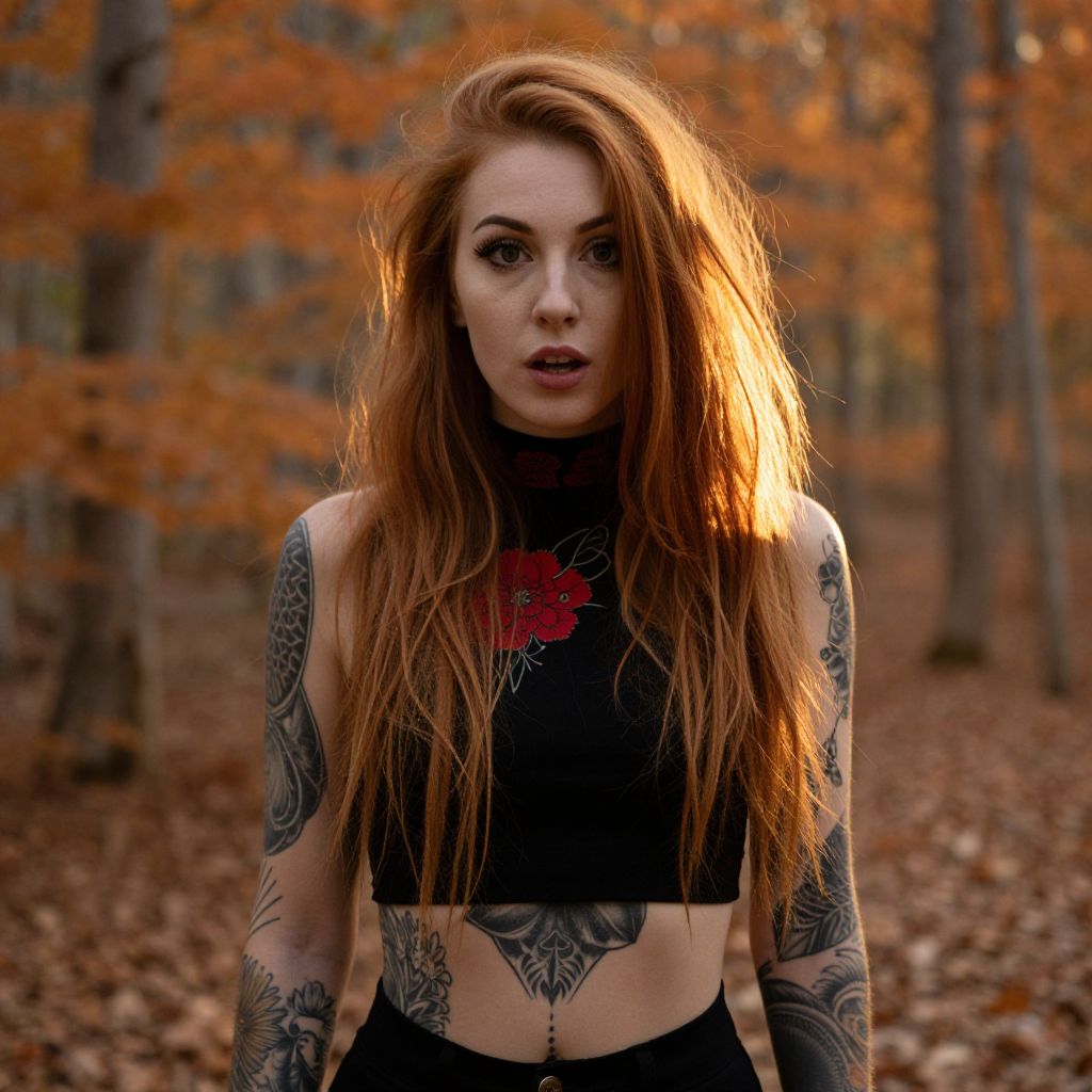 Photograph of a young woman with long, messy red hair standing in an autumn forest. She's wearing a black, high-neck top with red flower designs, and her arms and torso are heavily tattooed with intricate patterns. The background is filled with orange and brown leaves, with sunlight filtering through the trees, creating a warm, glowing effect. Her expression is slightly surprised or curious.