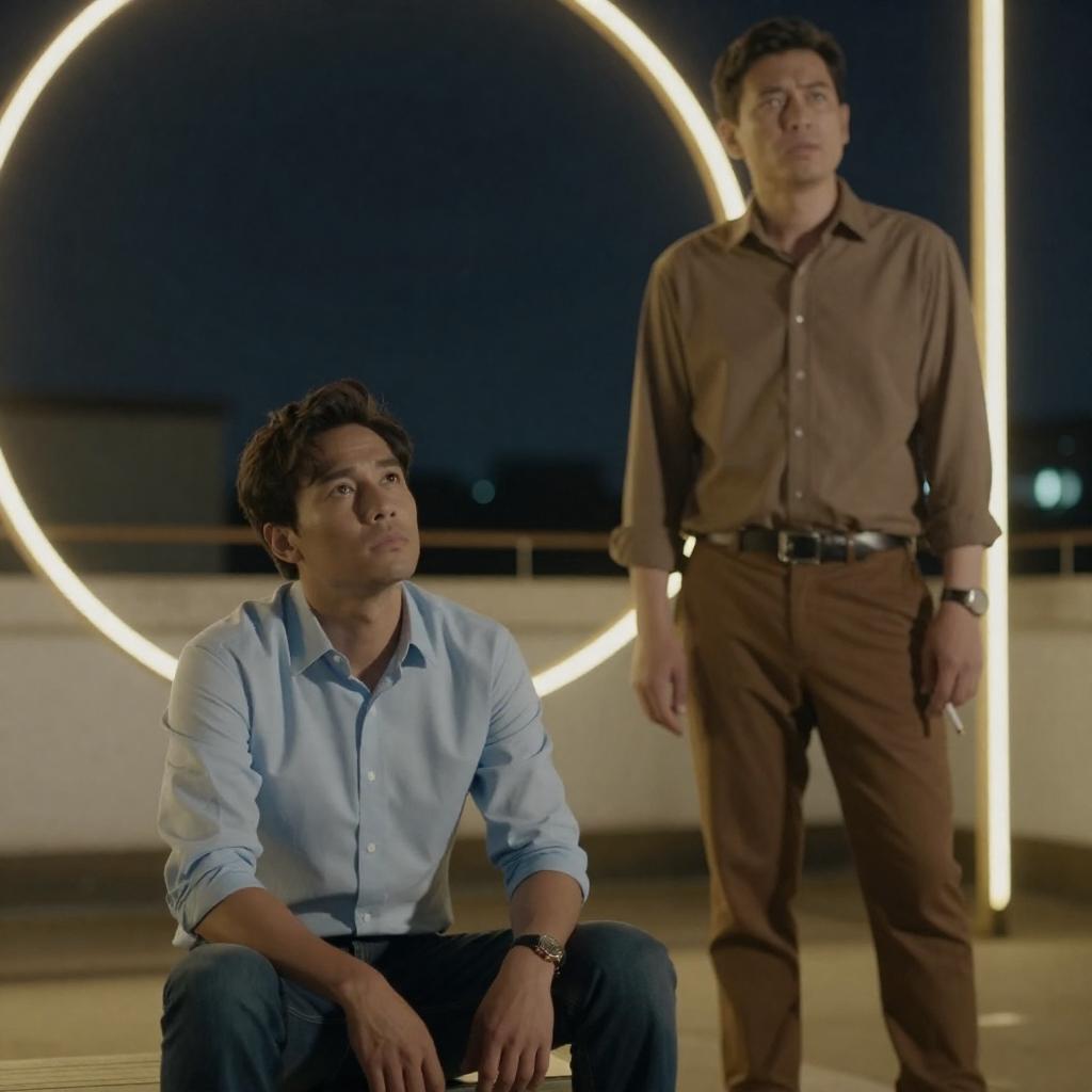 Photograph of three men standing in a wooden-walled room wearing dark business suits. The central man has short brown hair, dressed in a black shirt and jacket with an ID badge, looking upward with hands at his sides. The man on the left is smiling, wearing a dark suit and tie with hands clasped. The man on the right has a serious expression, also in a dark suit, white shirt, and hands clasped. All men wear ID badges.