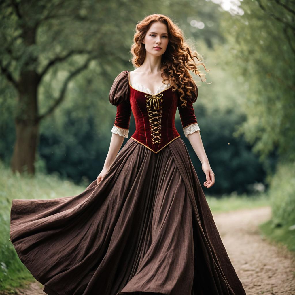 A young woman with long curly brown hair wearing a medieval style dress featuring a form-fitting bodice with lace-up detail and a flowing skirt. She is barefoot, posing elegantly on a cobblestone path surrounded by lush greenery with soft natural lighting and a bokeh background effect.