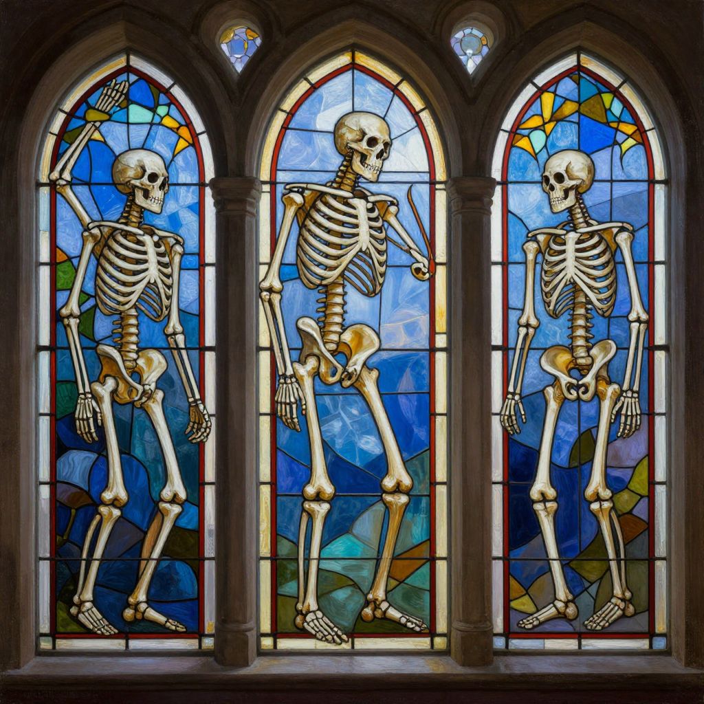 Photograph of three Gothic-style stained glass windows depicting skeletal figures standing in blue and yellow stained glass backgrounds.