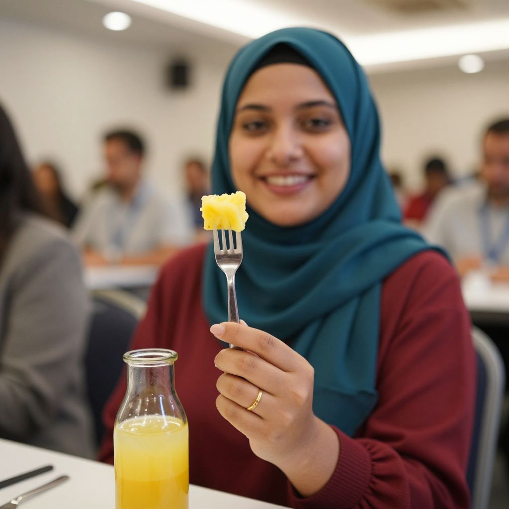 Hand holding a miniature fork with a small piece of pineapple, positioned in front of a smiling woman wearing a teal hijab and a red top, seated at a table with a glass bottle containing layered liquids, surrounded by blurred conference attendees in a well-lit indoor setting. #tbexathens #foodie