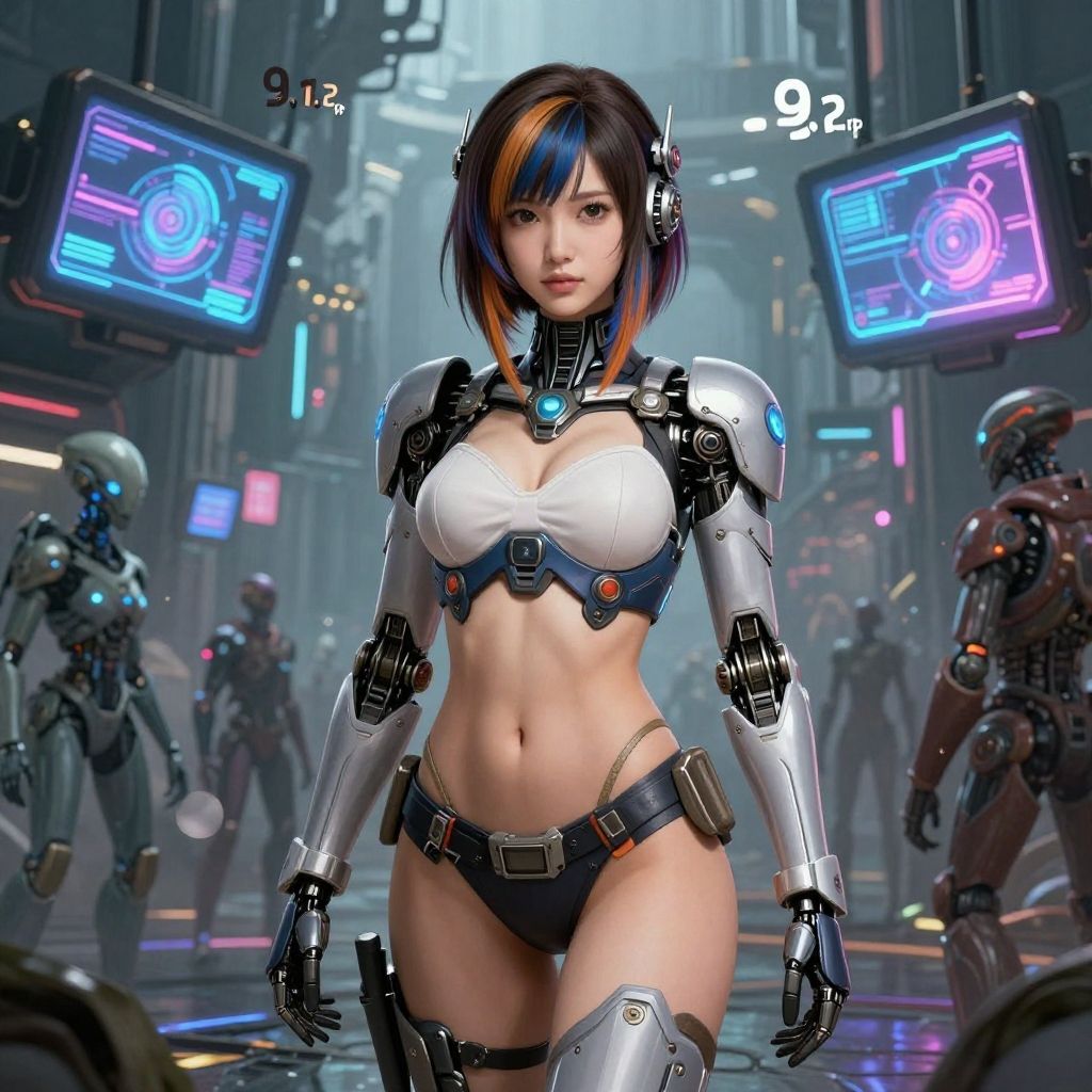This is a highly detailed, digital CGI artwork depicting a futuristic, cyberpunk-style scene. The central figure is an Asian woman with short, black hair featuring blue and orange highlights, wearing a revealing, silver and black cybernetic armor. Her armor includes a metallic chest plate, arm guards, and thigh-high boots, with a black thong-like bottom piece. She has a slim, toned physique with medium-sized breasts. In the background, there are neon-lit signs and holographic displays, including a "9:12" and "9:26" timer on the right. Other cybernetically enhanced individuals, wearing similar armor, are seen in the misty, urban setting. The scene is vibrant with neon colors and has a futuristic, sci-fi atmosphere.