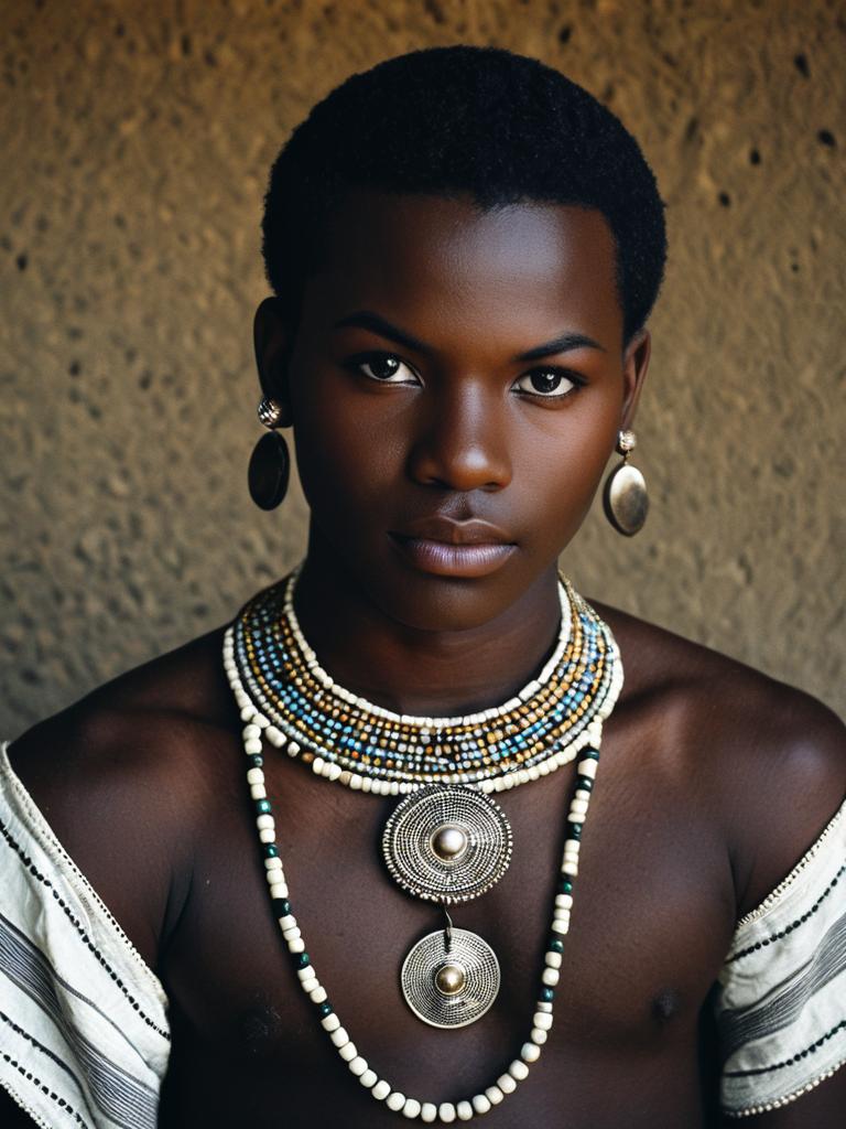 Tswana traditional costume, solo, jewelry, 1boy, necklace, male focus, earrings, beads, dark skin, looking at viewer, black hair