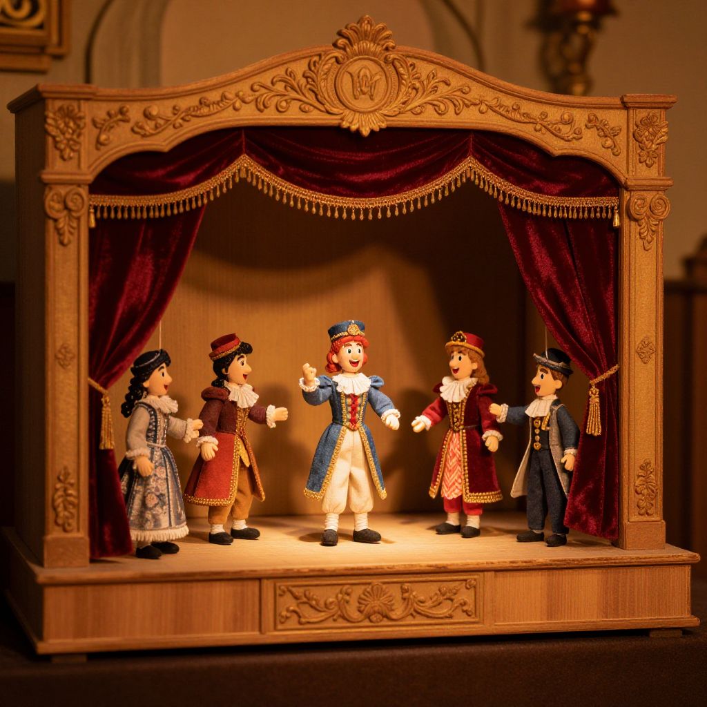 Photograph of a wooden puppet theater with five colorful puppets in 18th-century attire, standing on a stage with ornate curtains, under warm