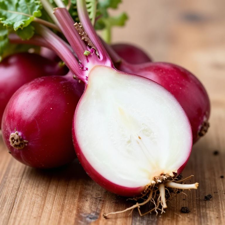 Close-up of a freshly harvested rabanito bunch, with dirt clinging to the roots, vibrant magenta-red skin and crisp white interior, placed on rustic wooden table with soft natural lighting, highly detailed botanical illustration style.
