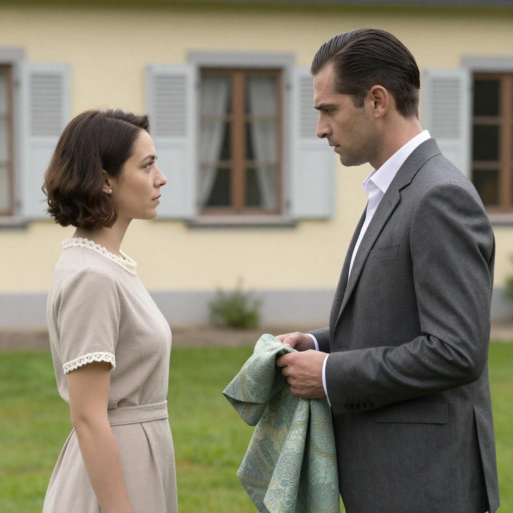 Photograph of two people. Man in brown suit and hat stands on left, facing woman in white coat on right, leaning on red geometric balcony. Red door behind woman, green trim, small green plants in front. Woman's expression neutral.