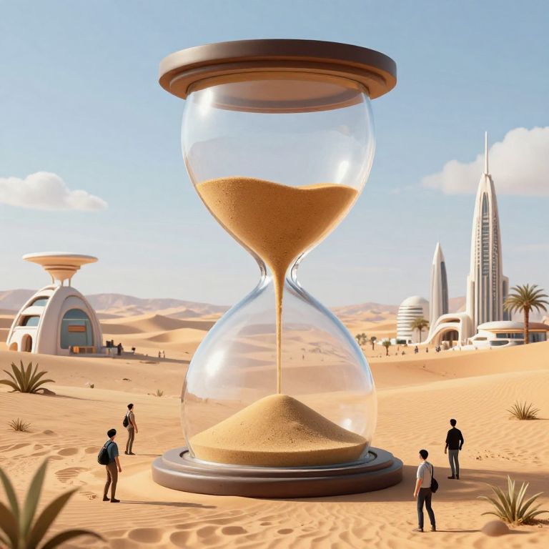 In a surreal 3D-rendered desert landscape, a colossal hourglass houses a bustling community where citizens adapt effortlessly to gravity's whims as sand flows seamlessly between its transparent chambers, showcasing a blend of fantasy and futuristic architectural design.