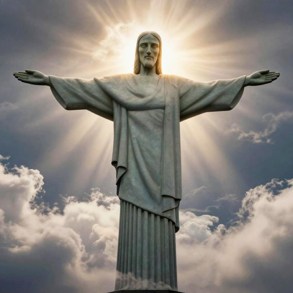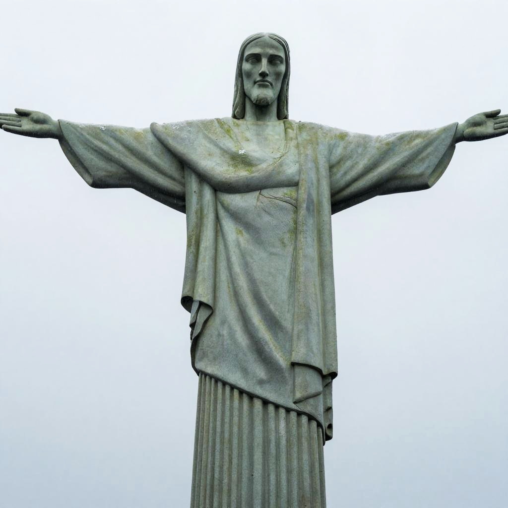Cristo redentor face carved in marble, detailed and majestic, perched on Corcovado Mountain with lush green forest below, bright daylight, photorealistic style with crisp shadows