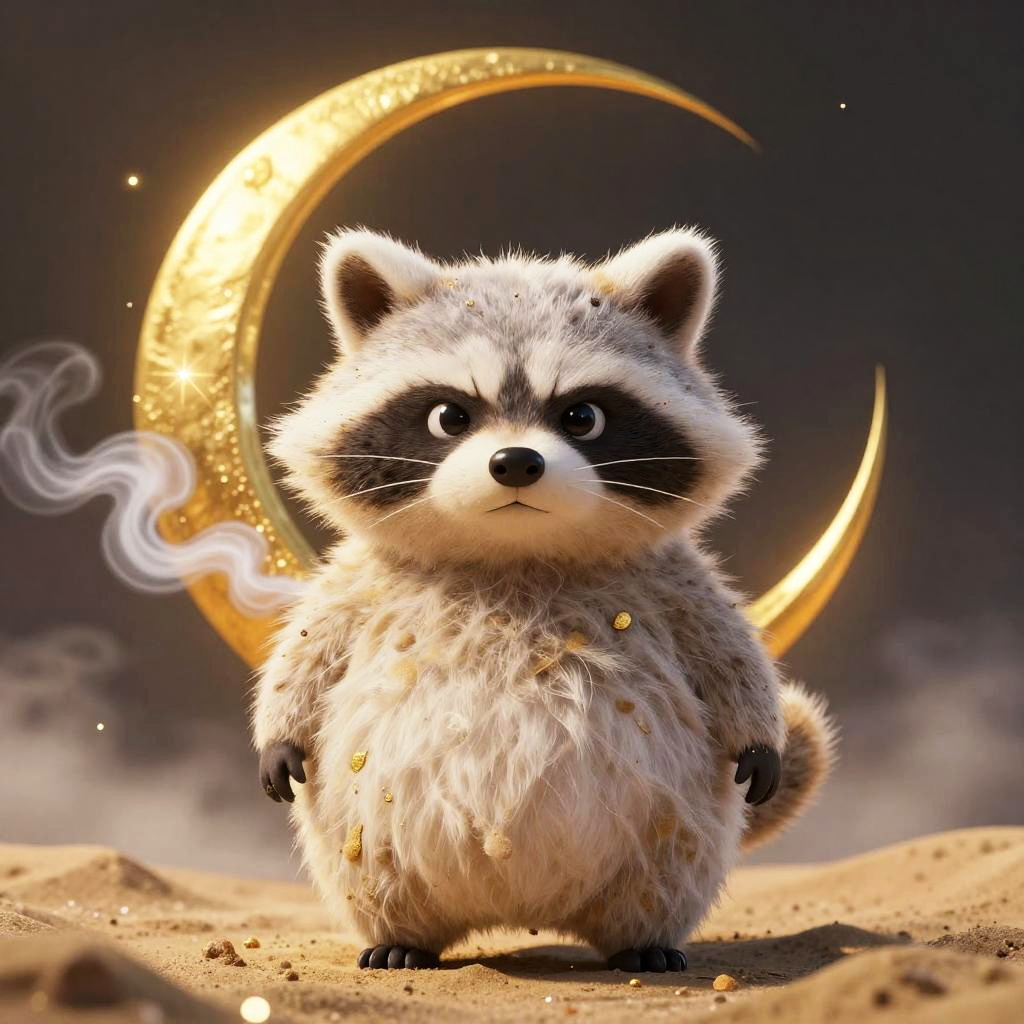 A digital illustration features a cute, fluffy raccoon standing on a sandy surface with a golden crescent moon and wisps of smoke in the background. The raccoon has a puffed-up, gray and white fur coat with black mask-like markings around its eyes, giving it a determined expression. The moon is adorned with sparkling particles, and the smoke adds a mystical atmosphere. The raccoon's small, rounded body and tiny paws contrast with the large, glowing moon, creating a whimsical and magical scene. The overall color palette includes soft grays, whites, and golds against a dark, smoky background.